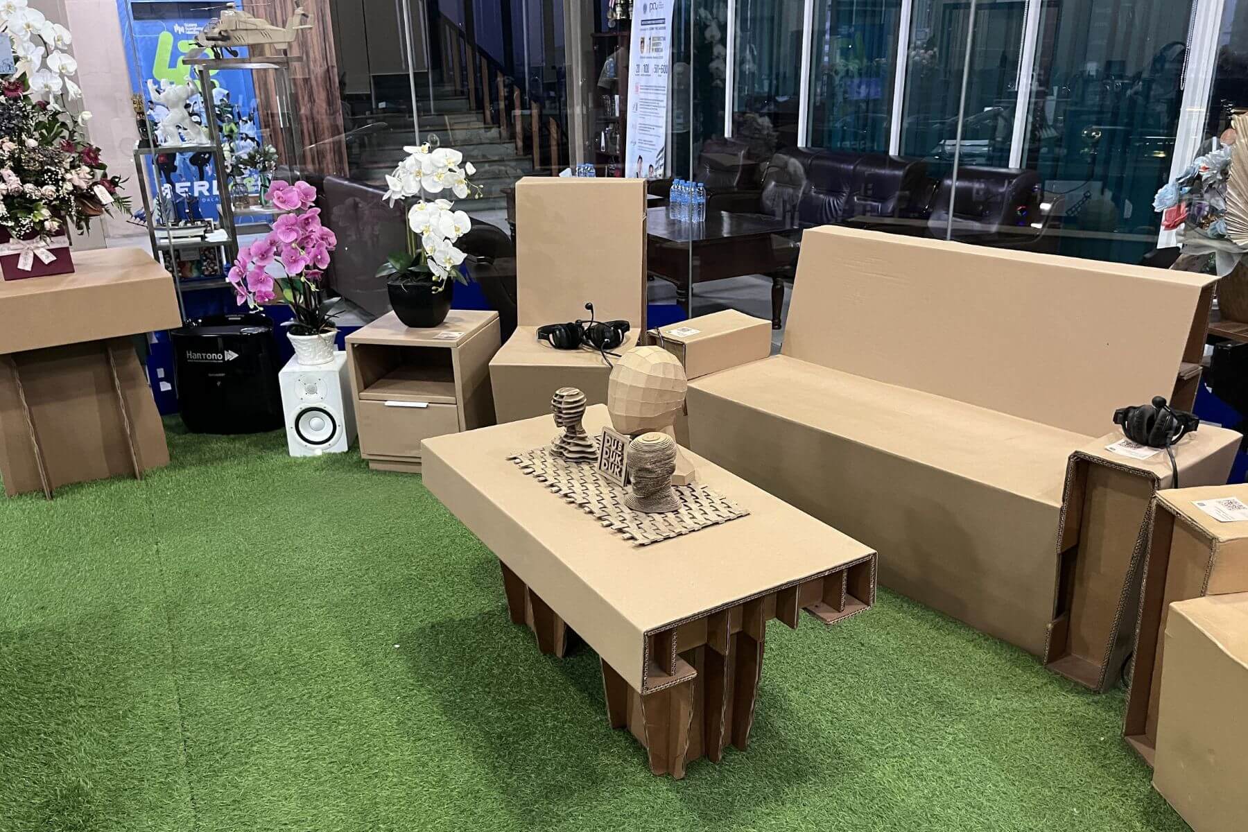 Dus Duk Duk menghadirkan furniture ramah lingkungan dari kardus 100% serat daur ulang dengan teknik stacking yang minim penggunaan lem dan dilengkapi sistem kuncian khusus. Kursi, sofa, dan meja dirancang kokoh hingga mampu menahan beban sampai 180 kg, sehingga menjadi solusi estetik, fungsional, sekaligus berkelanjutan untuk event, ruang edukasi, maupun kebutuhan display.